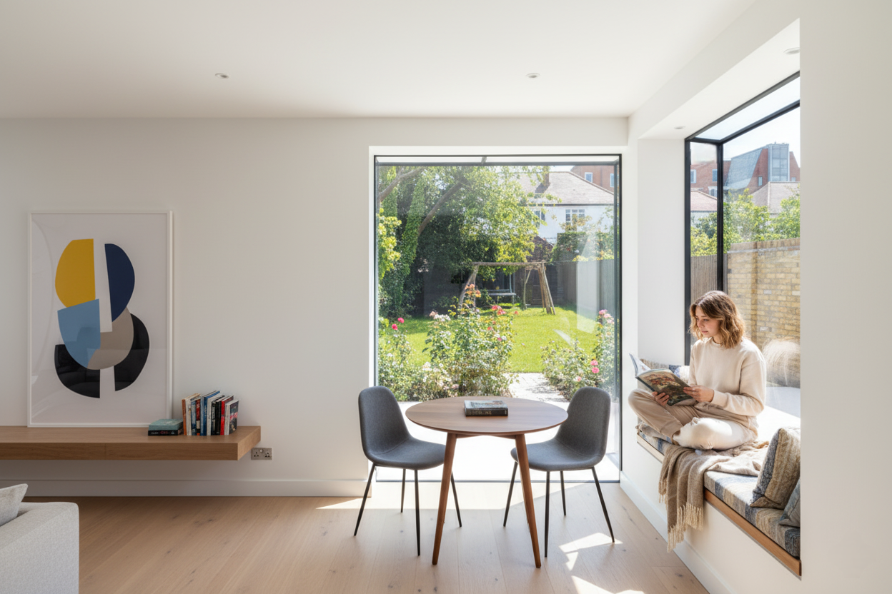 Sunlight pouring through a frameless Oriel Window in a London townhouse — alt="Oriel Windows UK bringing natural light into a contemporary home interior"